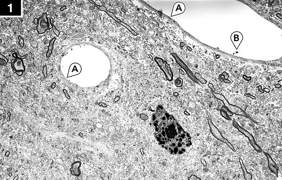 Tejido cerebral congelado y descongelado utilizando glicerol: Típica apariencia de materia gris a 6700 aumentos. Nótense intactas las células endoteliales capilares (A) y las partículas de carbón (B) en el lumen capilar. La apariencia general del neuropil y de los axones y neuronas es excelente.