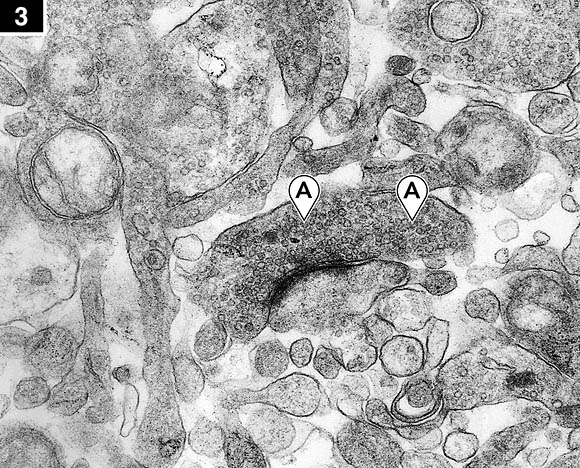 Tejido cerebral congelado y descongelado utilizando glicerol: Una sinapsis en la materia gris del hipocampo a 40.200 aumentos. La unión presináptica contiene pequeños paquetes de neurotransmisores (A) visibles como gránulos. Nótese la apariencia quebradiza general tanto de la membrana sináptica como de las estructuras adyacentes del neuropil. En todas las muestras examinadas se observó este grado de preservación a nivel sináptico.