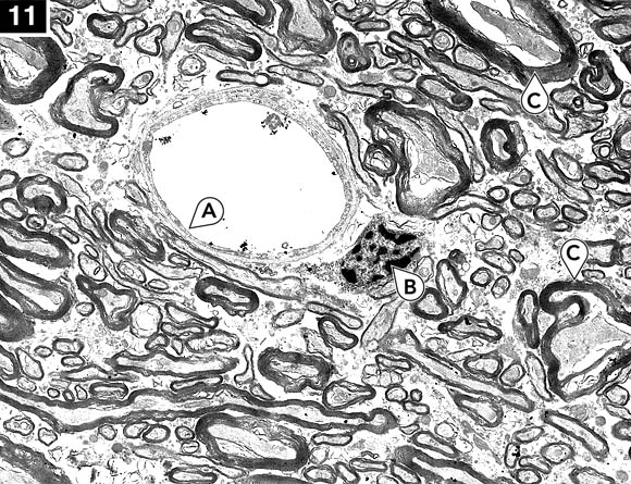 Tejido cerebral congelado y descongelado utilizando glicerol: La materia blanca del cuerpo calloso a 6700 aumentos. Nótese la excelente preservación de los capilares (A) y las membranas de plasma celular endotelial. El núcleo (B) muestra la típica perdida o reorganización del nucleoplasma; esto se ve con más frecuencia en cerebros congelados y descongelados que en cerebros sólo perfundidos con glicerol y fijados sin congelar. Varios axones (C) muestran el típico agrietamiento del axioplasma y alteración en la estructura de mielina. El incremento de espacio libre entre los axones y otras estructuras es el resultado de la deshidratación inducida por el glicerol.