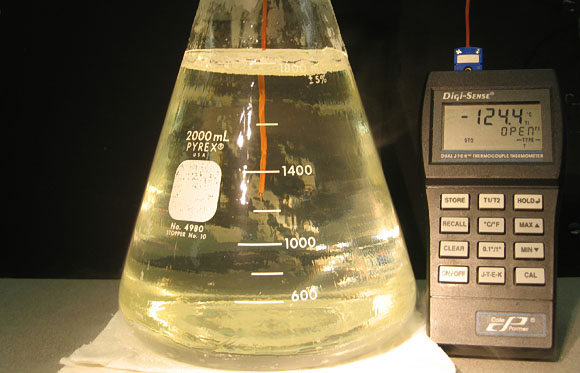 Solidificación sin congelación. Dos litros de la solución M22 enfriados hasta que se vitrifica como un sólido a la temperatura de -124º C. Todas las moléculas quedan bloqueadas como en un sólido amorfo. La creencia de que sólo se pueden vitrificar pequeñas muestras es un mito.